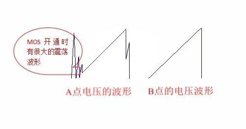 限流电阻连接一个RC到芯片,这一个RC的作用是用来滤波作用的,现在很多的芯片都会有一个前沿消隐功能,但是前沿消隐的时间不一定足够所以还是有加了RC,我们可以看下面的图,限流电阻上的电压波形有一个很大的震荡,有时候这个震荡的尖峰会超过我们的限流电压,但是这是寄生参数引起的,一般很难控制,加RC滤波后,到B点的波形就没有了这一个震荡,被RC滤除了。RC的是根据截止频率来设计得,一般是开关频率的10-30倍,如果是60kHz的开关频率时,我们会选择1k电阻与100pF电容,大概的截止频率1591kHz。